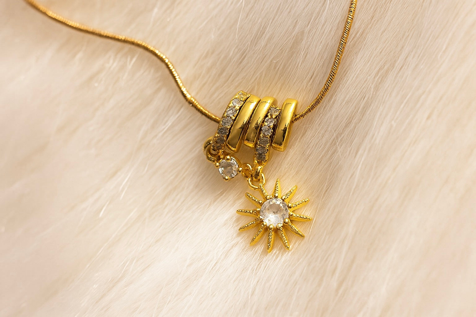 Brighten your look with the Radiant Sunburst Pendant Necklace, crafted to shine like the sun itself. Designed with a brilliant crystal centre and detailed golden rays, this necklace brings elegance, positivity, and sparkle to every outfit.
